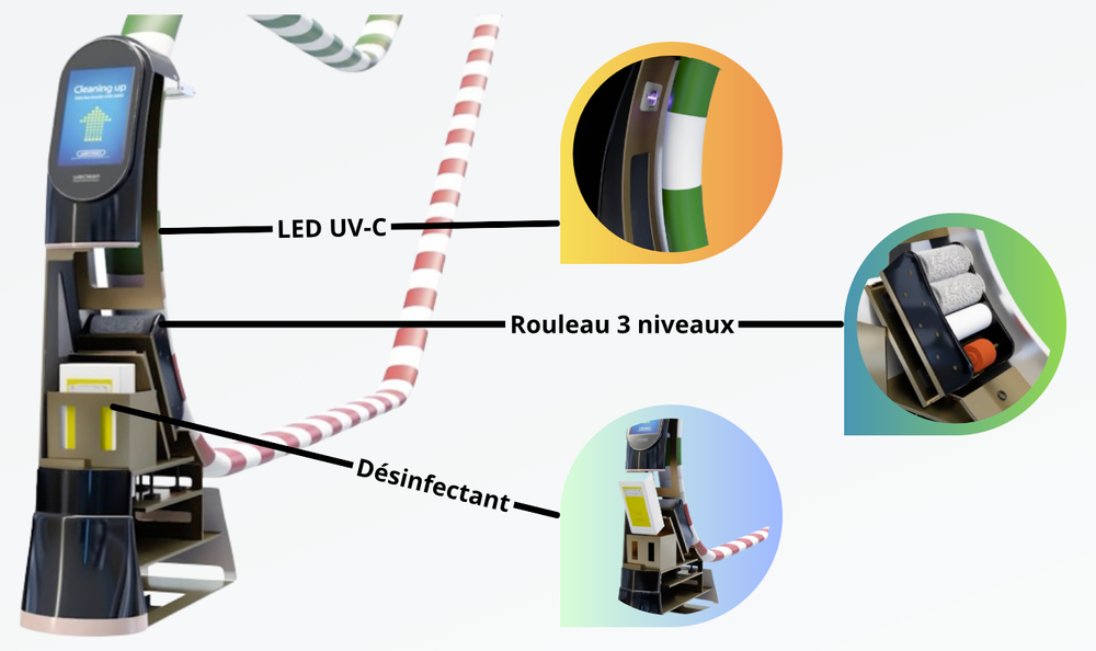 Nous assurons le renouvellement du liquide désinfectant et le changement des rouleaux de nettoyage pour maintenir la performance de l’appareil.